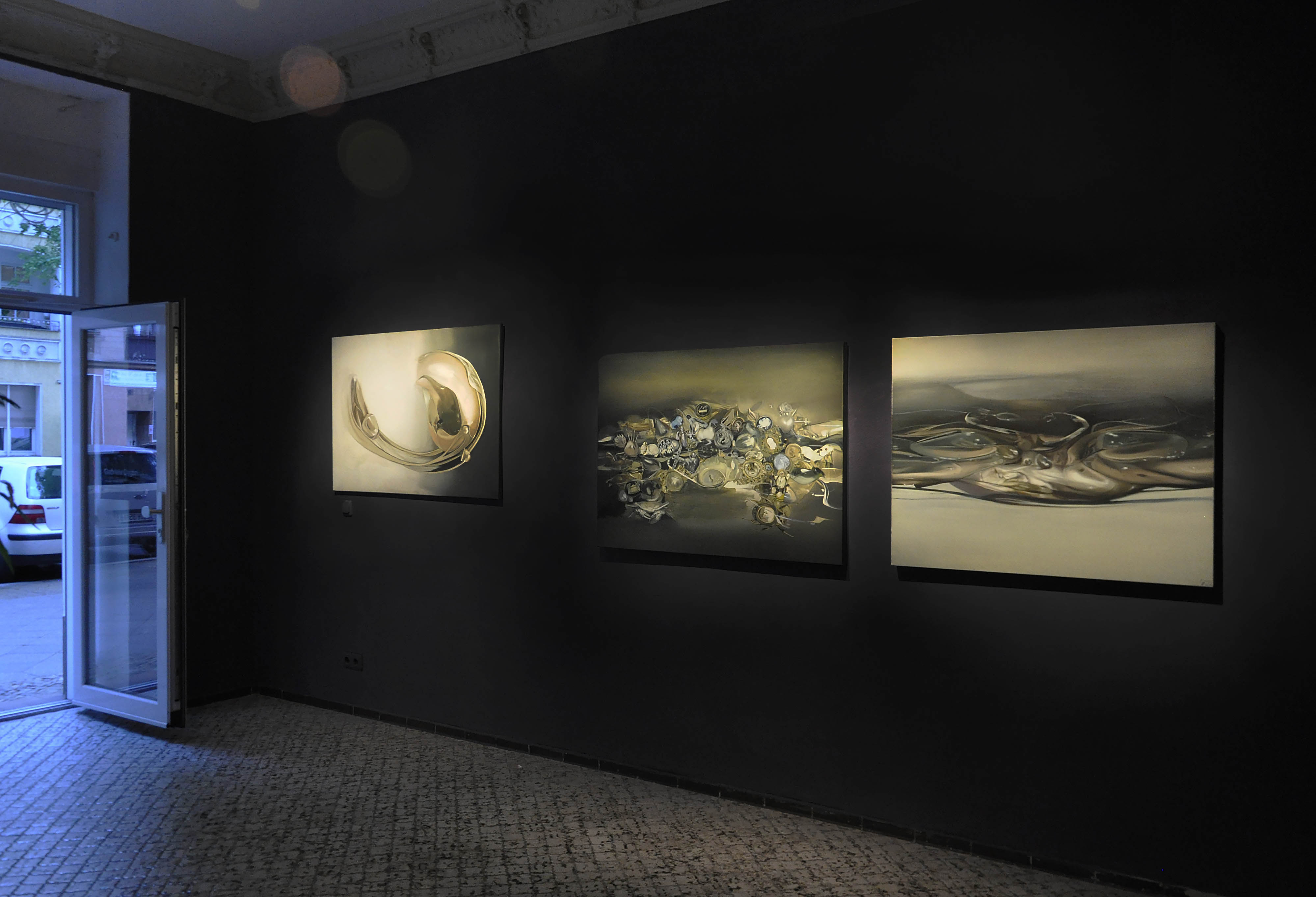 Specimens, oil on canvas, 120x90 cm,Porto, Portugal 2023/24Extravagant shells, discarded goblets, rotten fruit and bones. Impractical jewelry pieces, shiny insect shells, splintered vases, statues and trinkets washed ashore. Fish remains and rotting wood jiggle inertly to the rhythm of the murky wave.